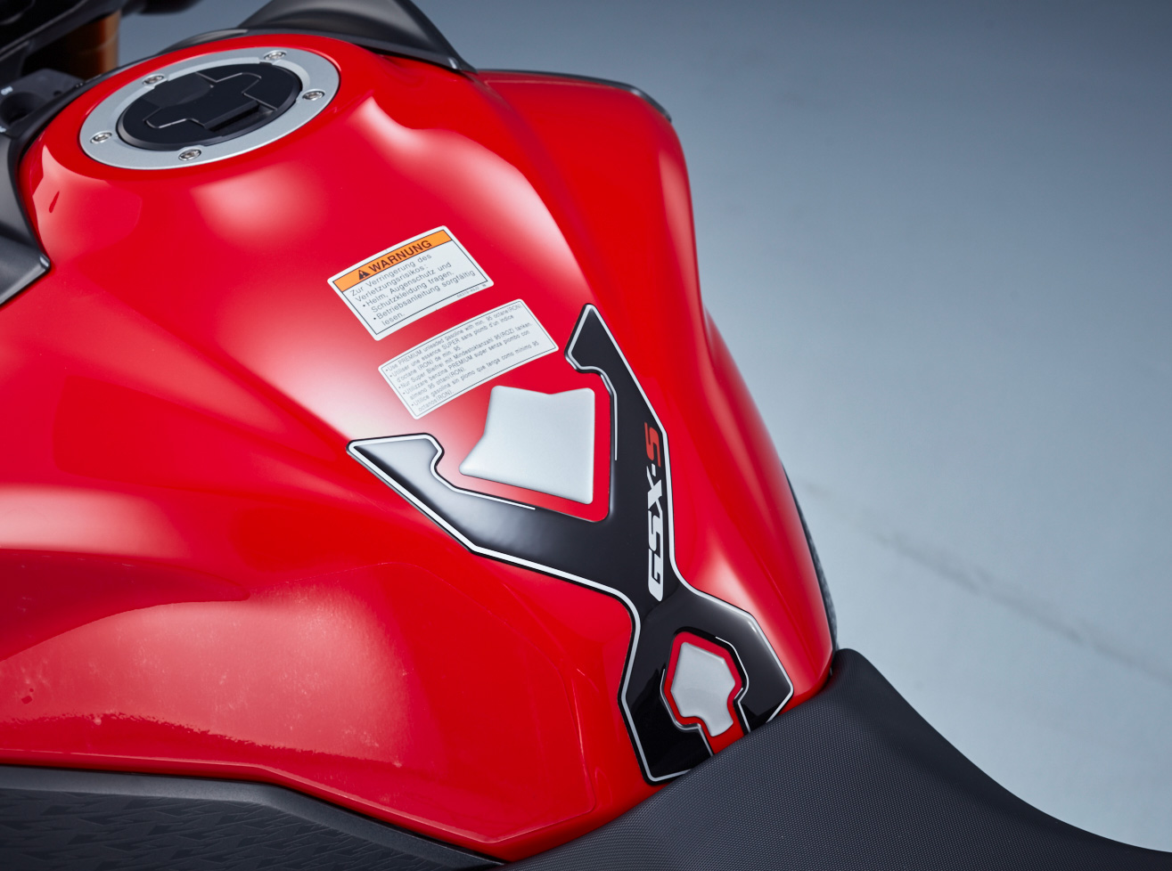 Les bords pointus/effilés peuvent endommager la surface du réservoir de la moto. Cette garniture de protection de réservoir en noir/argent et avec logo GSX-S