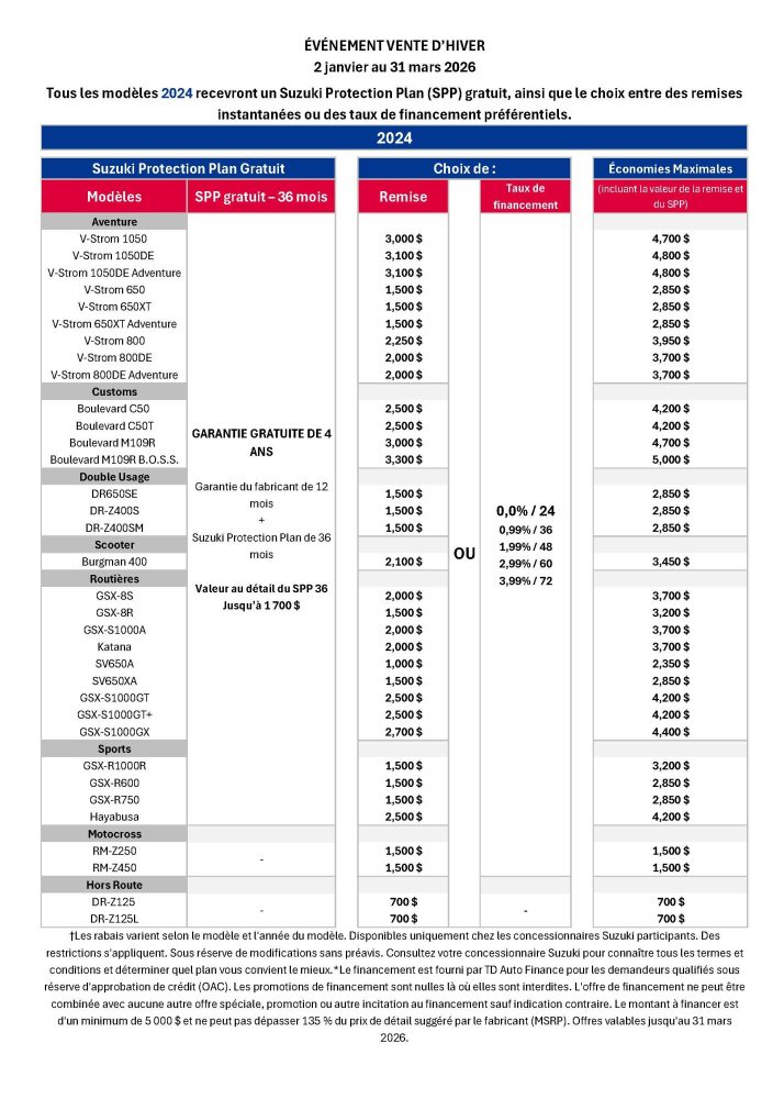 Toutes les promotions sont offertes du 13 janvier 2026 au 31 mars 2026 et ne peuvent être combinées à aucune autre offre spéciale, promotion ou incitatif de financement, sauf indication contraire. Les frais de transport, de préparation (PDI), les taxes et autres frais additionnels sont en sus lors de l’achat chez votre concessionnaire Suzuki.