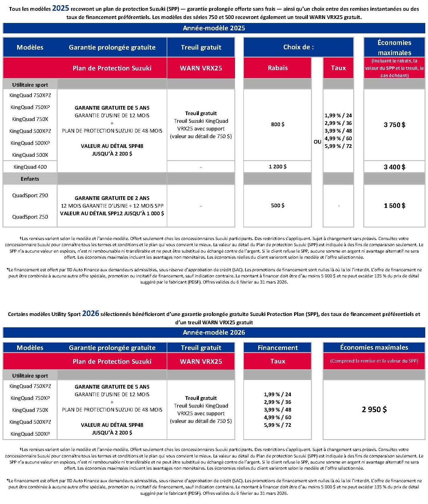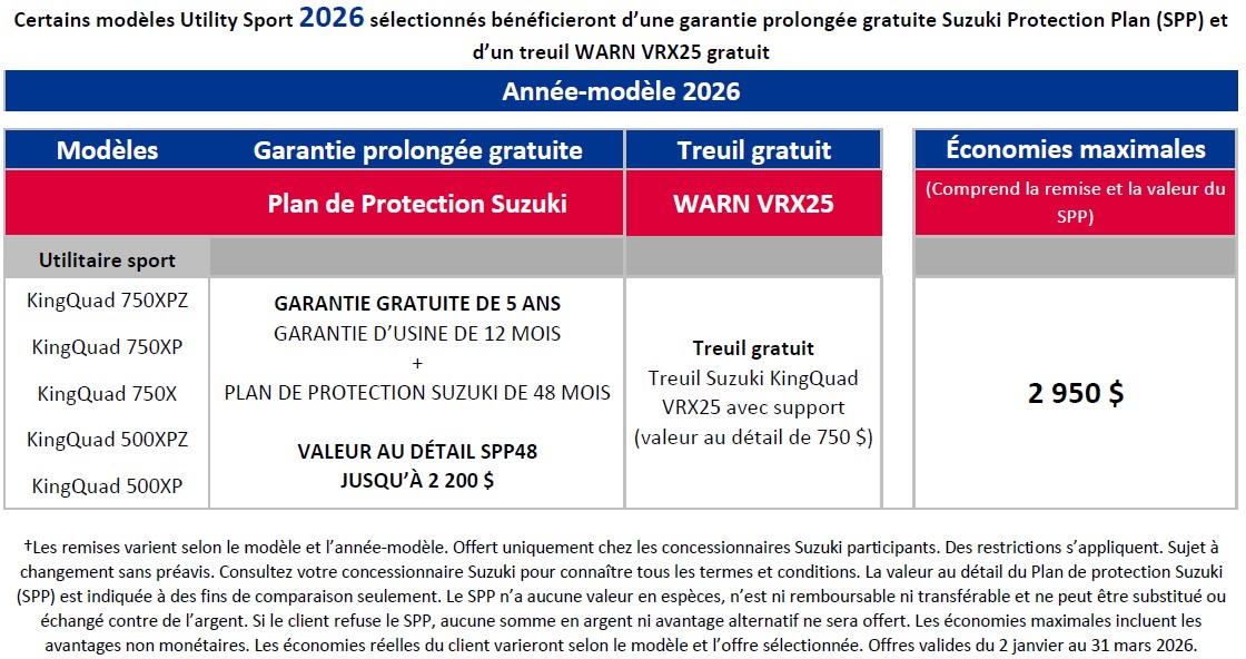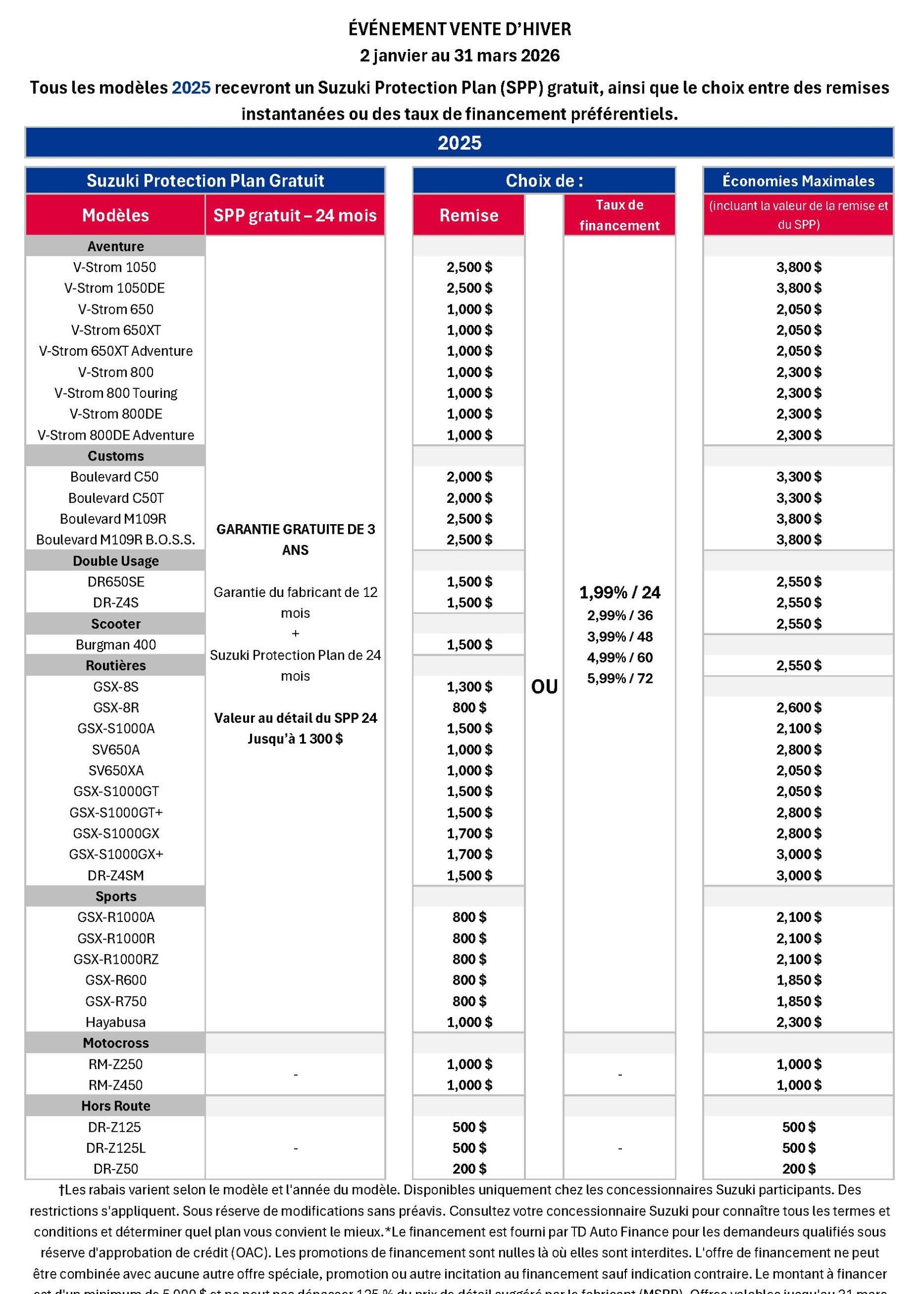 Toutes les promotions sont offertes du 13 janvier 2026 au 31 mars 2026 et ne peuvent être combinées à aucune autre offre spéciale, promotion ou incitatif de financement, sauf indication contraire. Les frais de transport, de préparation (PDI), les taxes et autres frais additionnels sont en sus lors de l’achat chez votre concessionnaire Suzuki.