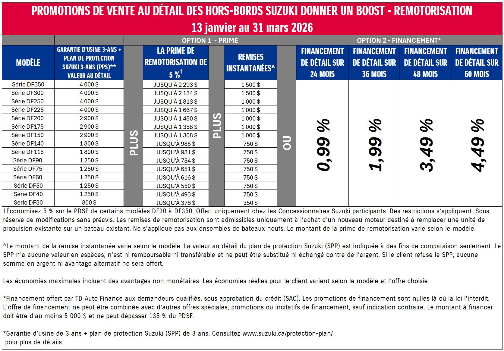 ^Remises instantanées sur certains moteurs hors-bord Suzuki.