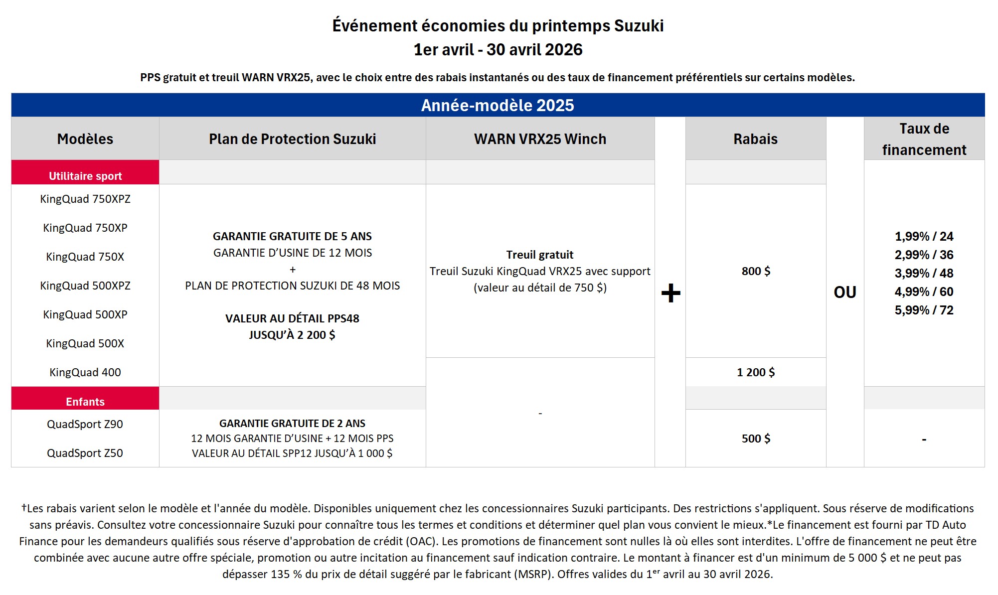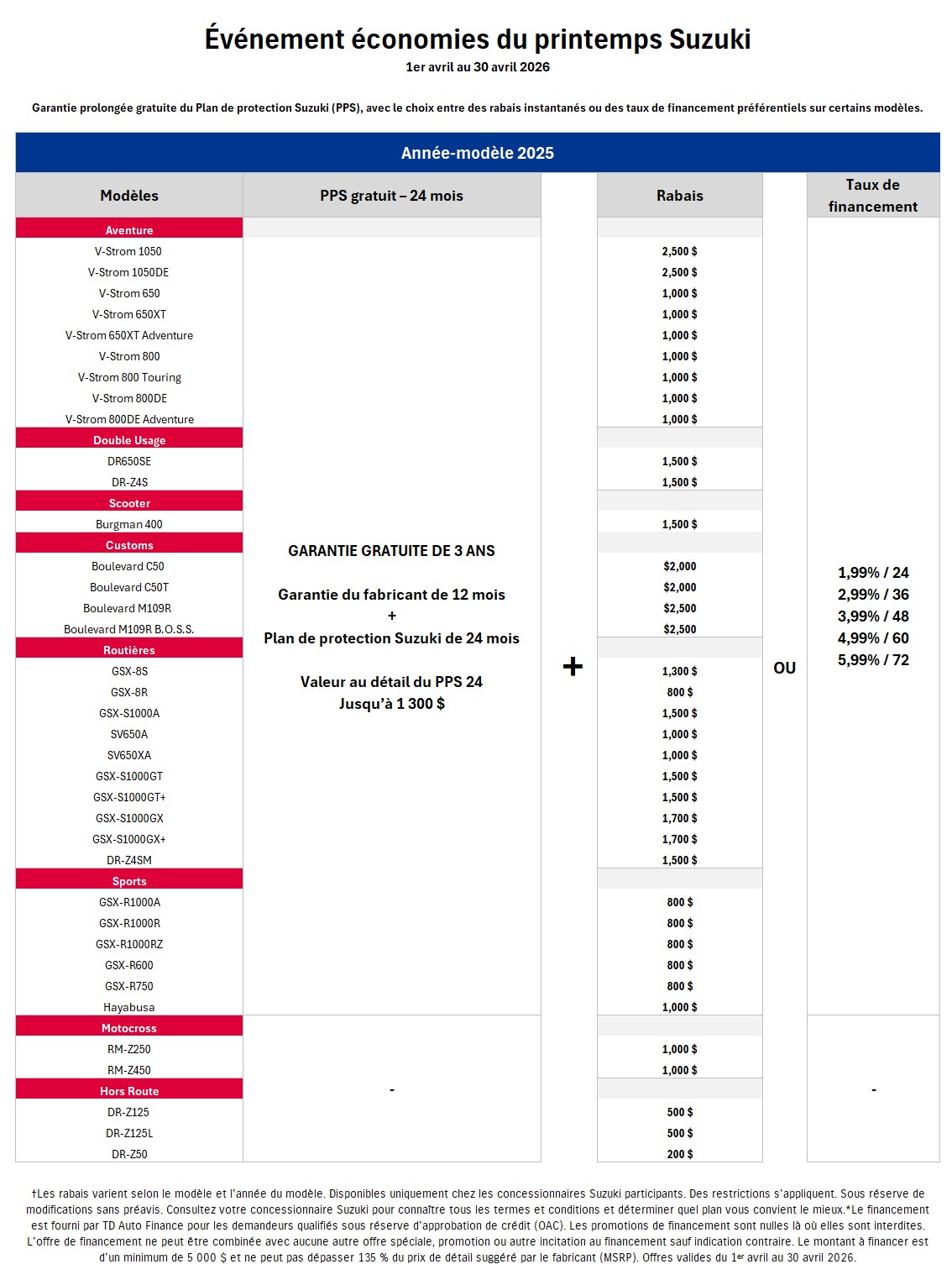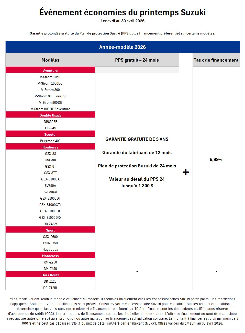 Les remises varient selon le modèle et l’année-modèle. Offres valables uniquement chez les concessionnaires Suzuki participants. Des restrictions s’appliquent. Offres sujettes à modification sans préavis. Consultez votre concessionnaire Suzuki pour connaître l’ensemble des modalités et déterminer l’offre qui vous convient le mieux. Offres valides jusqu’au 30 avril 2026.