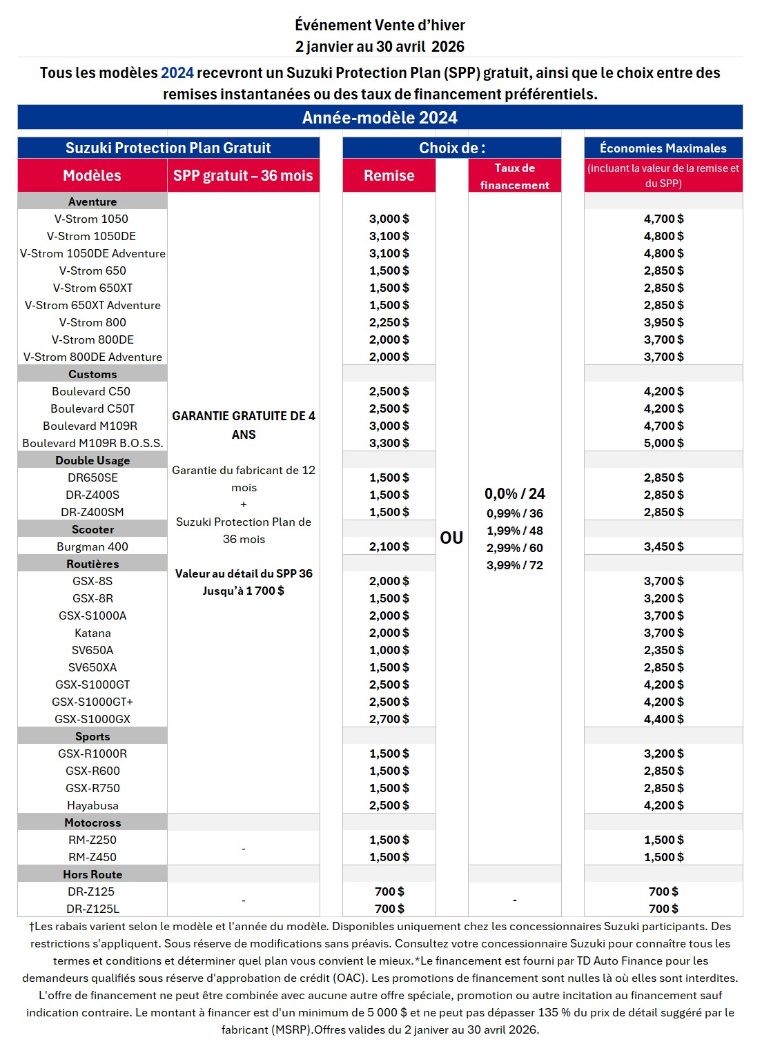 †Les remises varient selon le modèle et l’année-modèle. Offres valables uniquement chez les concessionnaires Suzuki participants. Des restrictions s’appliquent. Offres sujettes à modification sans préavis. Consultez votre concessionnaire Suzuki pour connaître l’ensemble des modalités et déterminer l’offre qui vous convient le mieux. Offres valides jusqu’au 30 avril 2026.