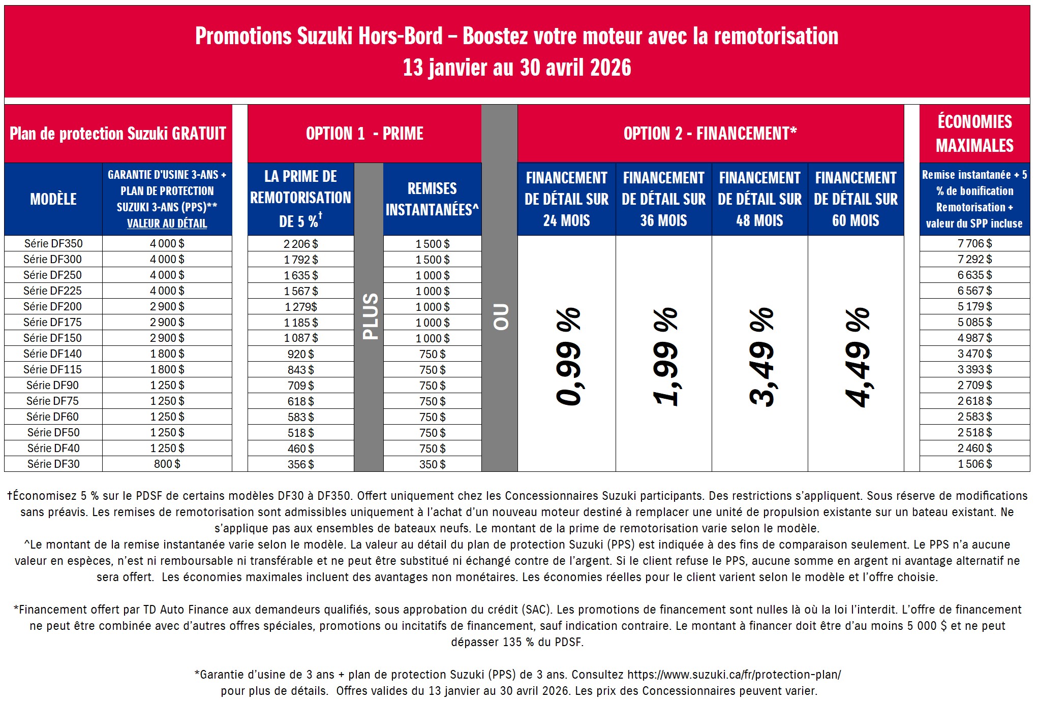 †Économisez 5 % sur le PDSF de certains modèles DF30 à DF350. Offres valables uniquement chez les concessionnaires Suzuki participants. Des restrictions s’appliquent. Offres sujettes à modification sans préavis. Les remises de remise à neuf (repower) sont admissibles uniquement à l’achat d’un moteur neuf destiné à remplacer un groupe motopropulseur existant sur une embarcation existante. Ne s’applique pas aux ensembles bateau neufs. Le montant du bonus de remise à neuf varie selon le modèle.
