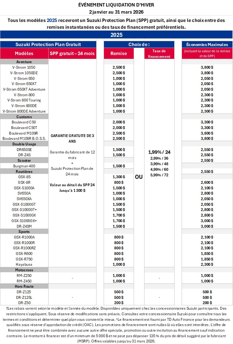 †Les remises varient selon le modèle et l’année-modèle. Offres valables uniquement chez les concessionnaires Suzuki participants. Des restrictions s’appliquent. Offres sujettes à modification sans préavis. Consultez votre concessionnaire Suzuki pour connaître l’ensemble des modalités et déterminer l’offre qui vous convient le mieux. Offres valides jusqu’au 31 mars 2026.