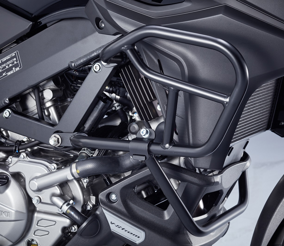 Every adventure touring bike needs a stylish accessory bar like this one. With either a matte-black or bronze powder-coated finish, this accessory bar accentuates the V-Strom’s unique touring look.