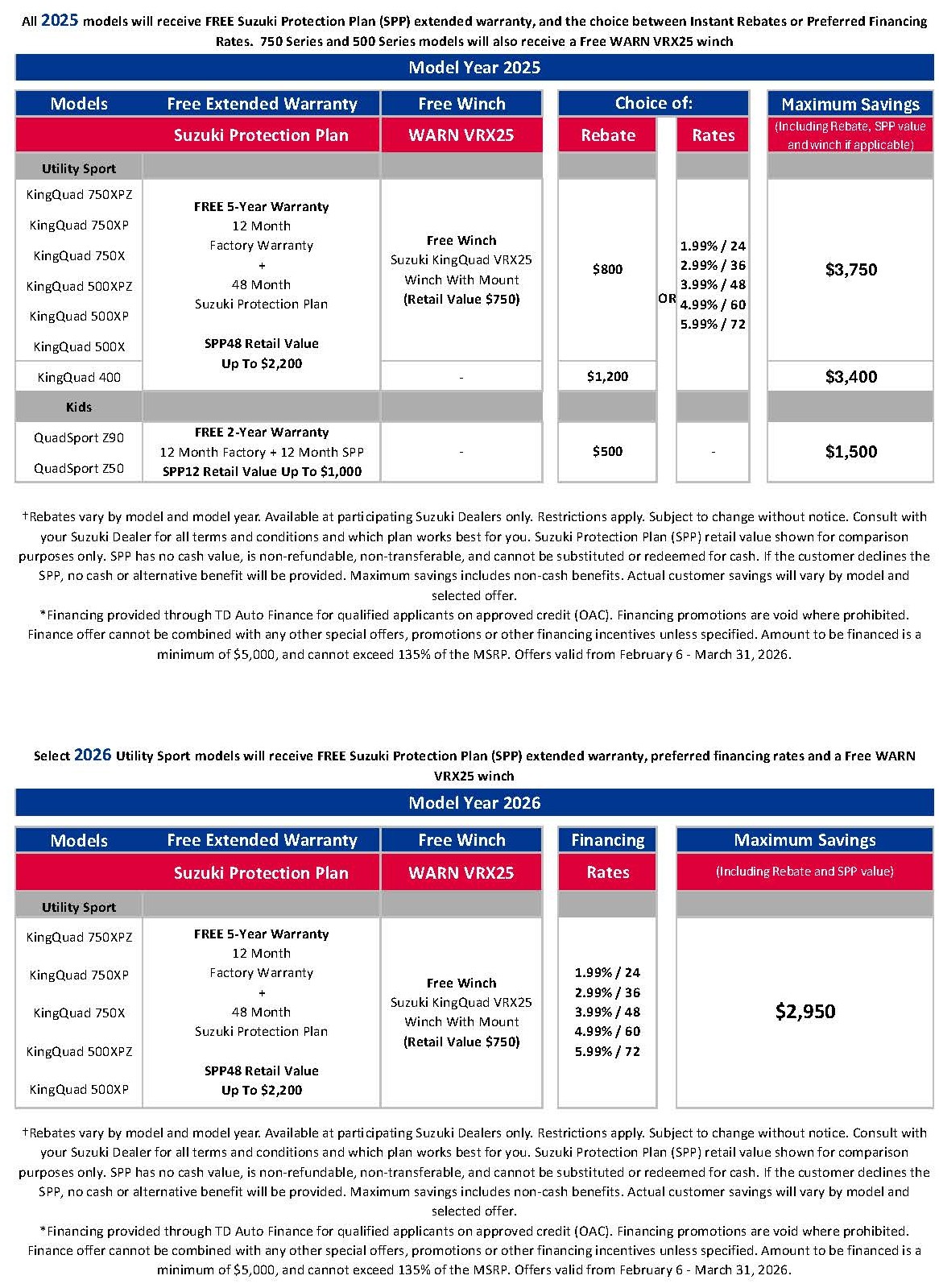 †Rebates vary by model and model year. Available at participating Suzuki Dealers only. Restrictions apply. Subject to change without notice. Consult with your Suzuki Dealer for all terms and conditions and which plan works best for you. Offers valid until March 31, 2026.