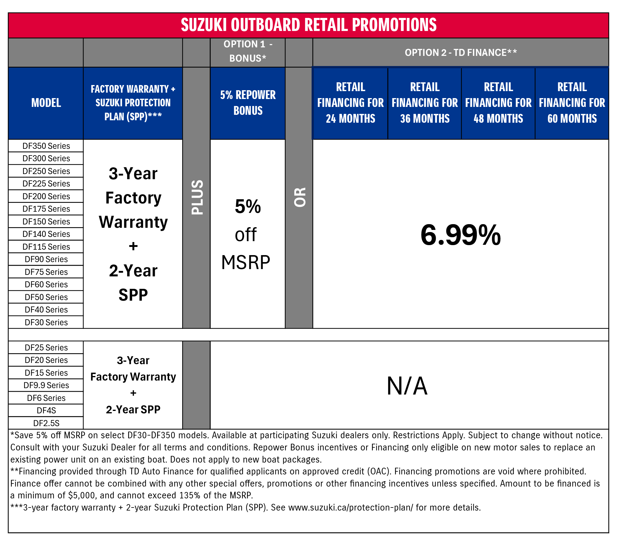 - TD Financing: As low as 6.99% is available on select Suzuki Ultimate Outboard Motors, on approved credit (OAC). Financing provided through TD Auto Finance for qualified applicants. Financing promotions are void where prohibited. Terms from 24 to 60 months are available and applicable on DF30 – DF350 models. Purchase financing is offered at various rates and terms, based on the model purchased. See Retail Incentive charts for all finance options. Finance offers cannot be combined with any other special offers, promotions, or financing incentives unless specified. The amount to be financed cannot exceed 135% of the MSRP. The effective rate of borrowing will vary depending on the model and amount financed.